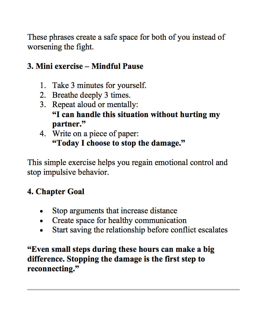 In just 72 hours, "72 Hours to Reconnect" will guide you, step by step, to calm emotions, clarify conversations, and rebuild the closeness you’ve been missing — all in just 10 minutes a day.